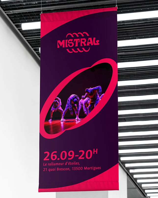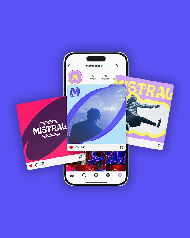 L’identité visuelle de Mistral s’articule autour d’un concept évocateur : l’empreinte du souffle. À l’image du vent qui laisse des traces invisibles et sculpte les paysages, cet axe graphique capture l’énergie en mouvement. Il traduit la vitalité de l’association à travers une iconographie abstraite et vivante, où chaque élément devient la trace tangible d’un élan créatif.